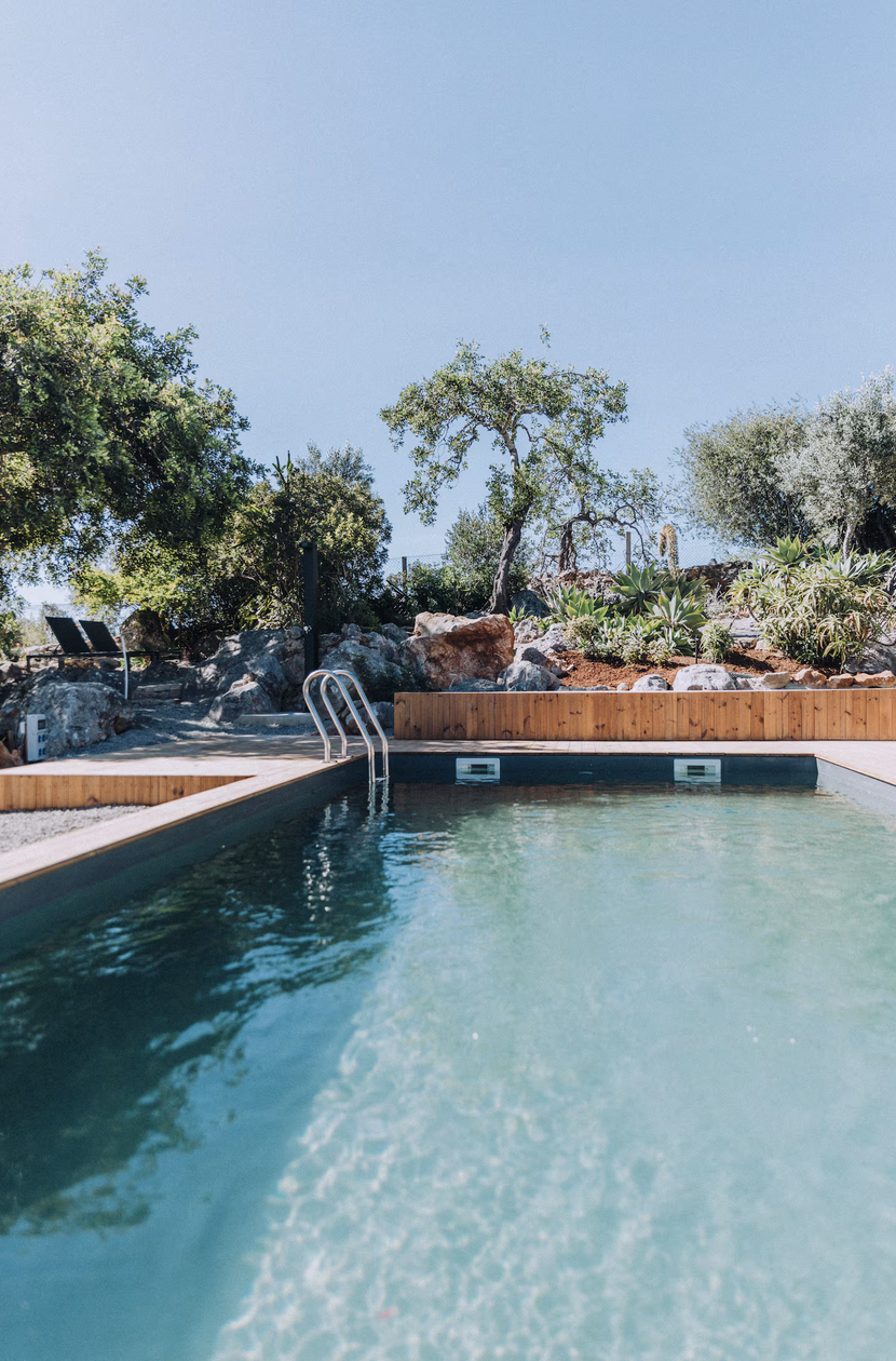 Neem een verfrissende duik in het zwembad, dat subtiel is ingebed in de glooiende heuvels en harmonieus opgaat in de tuin vol geurige bloemen, oude bomen en verborgen zitjes.